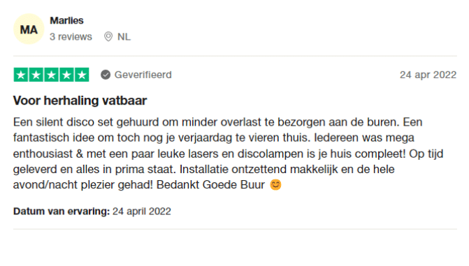 Op Trustpilot zijn meer dan 100 geverifieerde reviews te vinden van klanten die ervaring hebben met de diensten van Goede Buur Silent Disco. De meeste reviews zijn zeer positief en loven de goede kwaliteit van de koptelefoons, de snelle levering en de vriendelijke en behulpzame klantenservice. Ook wordt Goede Buur geprezen om de flexibiliteit en de goede prijs-kwaliteitverhouding.